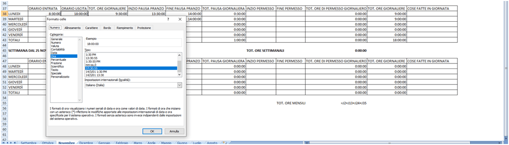 per prima cosa si deve formattare il formato celle degli importi da sommare con la codifica 00:00:00, come segue: