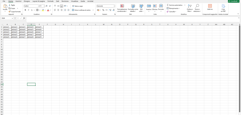 Un secondo metodo per aggiungere più righe o più colonne in un foglio excel è il seguente, partendo da un foglio di calcolo come questo