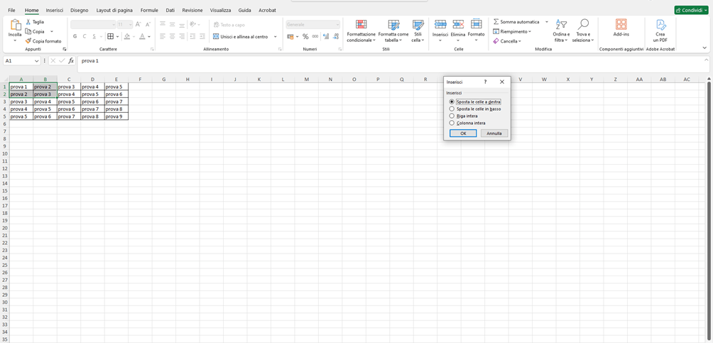 per esempio, se seleziono “Sposta celle in basso” avremo questo risultato